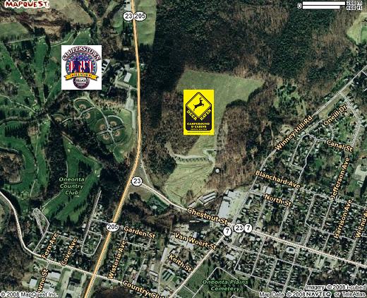 Take exit 13. If coming from the West, make a left at the end of the off-ramp or if coming from the East make a right. In either case, drive North on Rt 23/205 North for 1 mile. At the second blinking light, turn right onto Rt 23 East (also named Chestnut Street). Drive 1500ft and our entrance will be on the left. The campground office is all the way at the top of the hill.